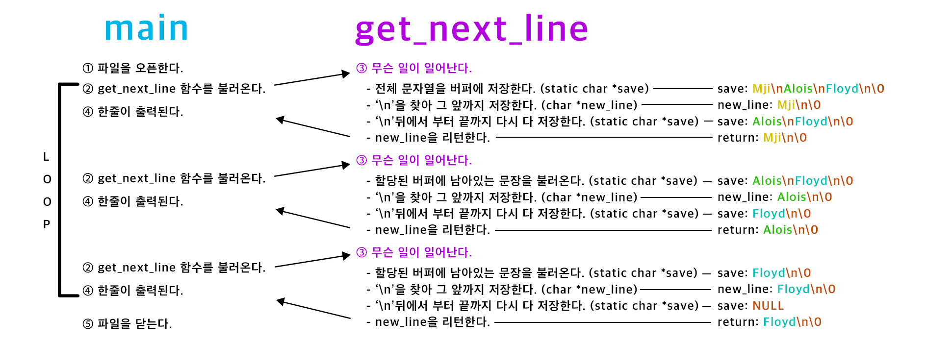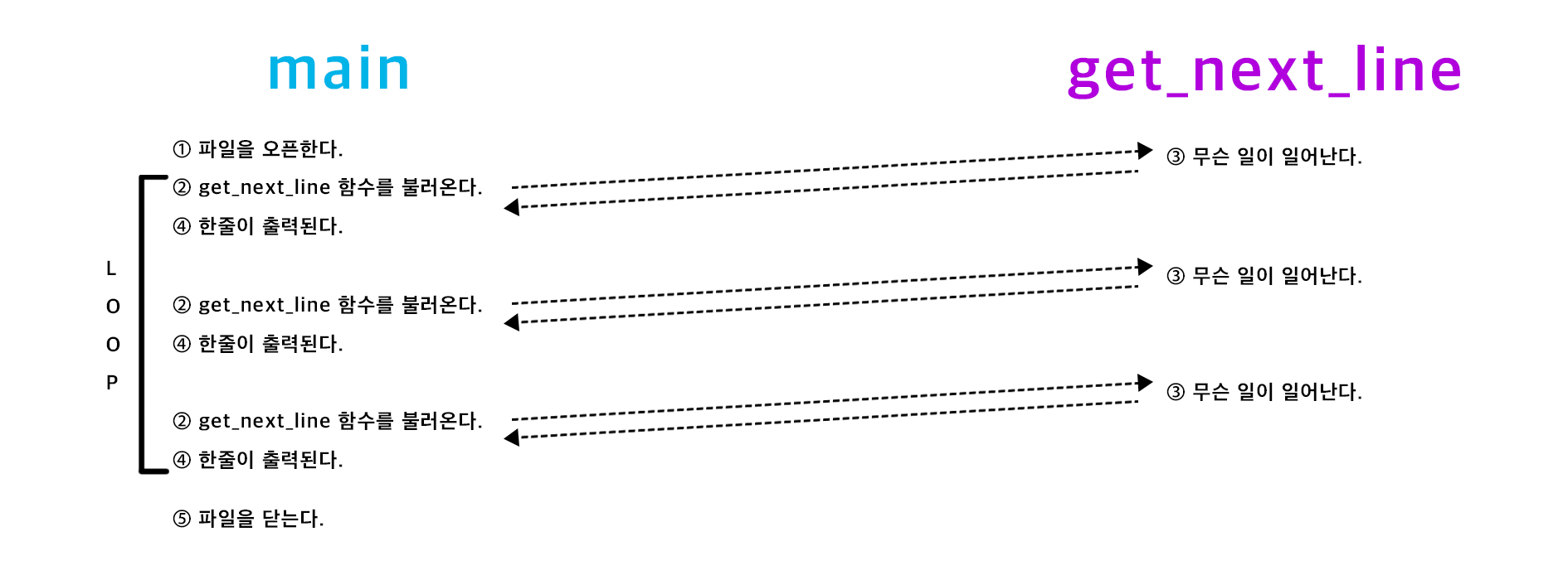 나는 처음 gnl을 할때 이게 가장 헷갈리는 부분이었는데, 메인에서 루프를 돌려 get_next_line은 문장에서 \n을 만나면 그 전까지만 메인에 전달하는 역할을 한다. 그리고 gnl에서는 \n 뒤로 나머지 문자열이 저장되어 있다! 그렇다면 gnl에서는 어떤 일이 벌어지는지 살펴보자.