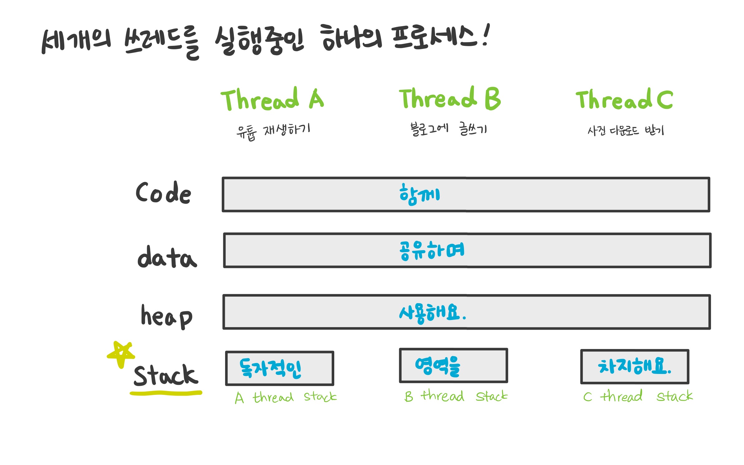 만약에 우리가 크롬 내에서 1.유튜브를 보면서 2.블로그에 글을 쓰고 동시에 3.사진을 다운받는다고 가정해 보자. 그러면 하나의 프로세스(작업)에서 아래와 같이 3개의 일이 동시에 돌아갈 것이다. 이렇게 여러 가지의 작업 갈래가 생기는 것을 스레드 (thread)라고 부른다.
