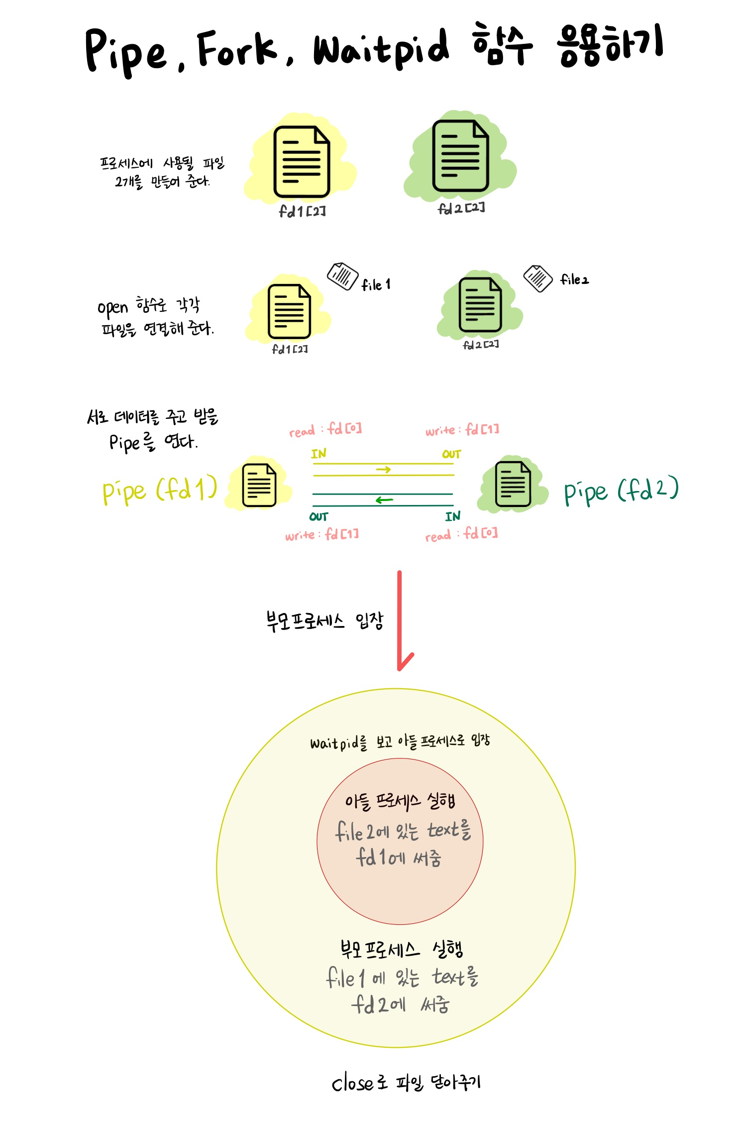 - 이 함수는 크기가 항상 2인 함수여야만 한다. 왜냐하면 들어가는 입력 fd[0]와 출력 fd[1]이 항상 있기 때문이다!