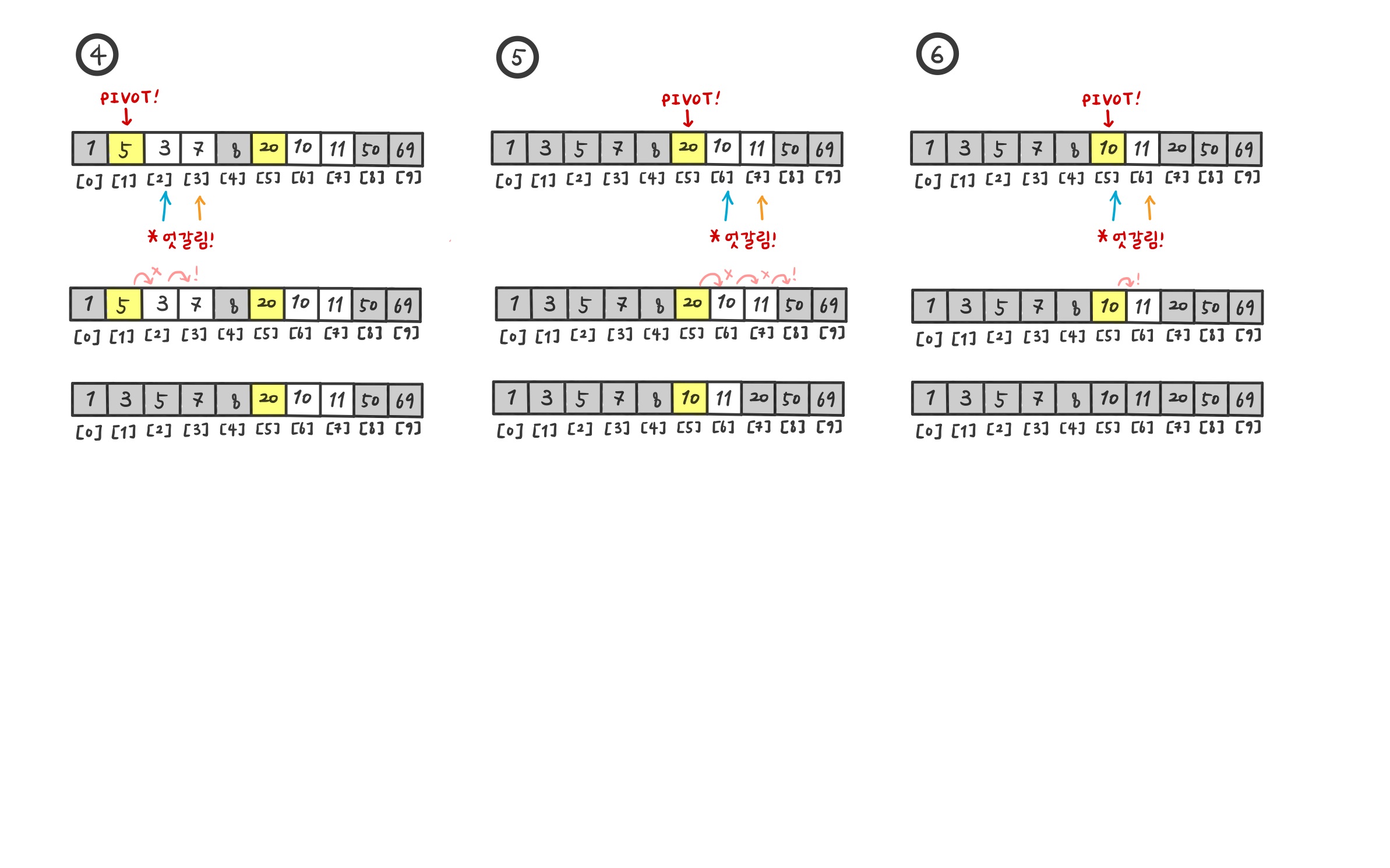right는 왼쪽으로 이동하면서 pivot값보다 크면 쭉쭉 나아가고, 작면 멈춘다.