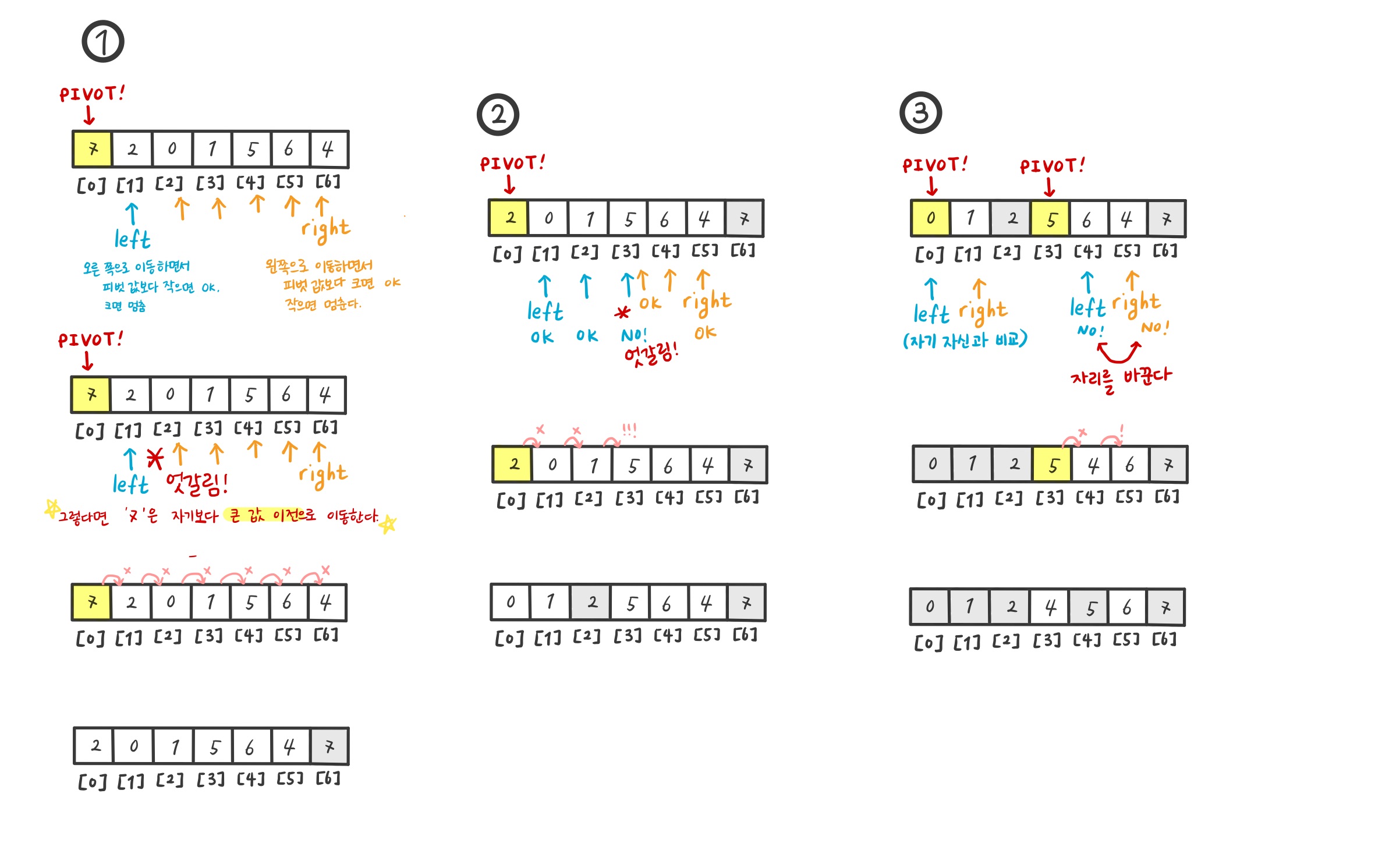 피벗(pivot)은 맨 앞의 숫자든, 맨 뒤의 숫자든, 중간에 어떠한 숫자든 상관없다. 보통 컴퓨터에서는 맨 앞 숫자를 정한다고 한다.