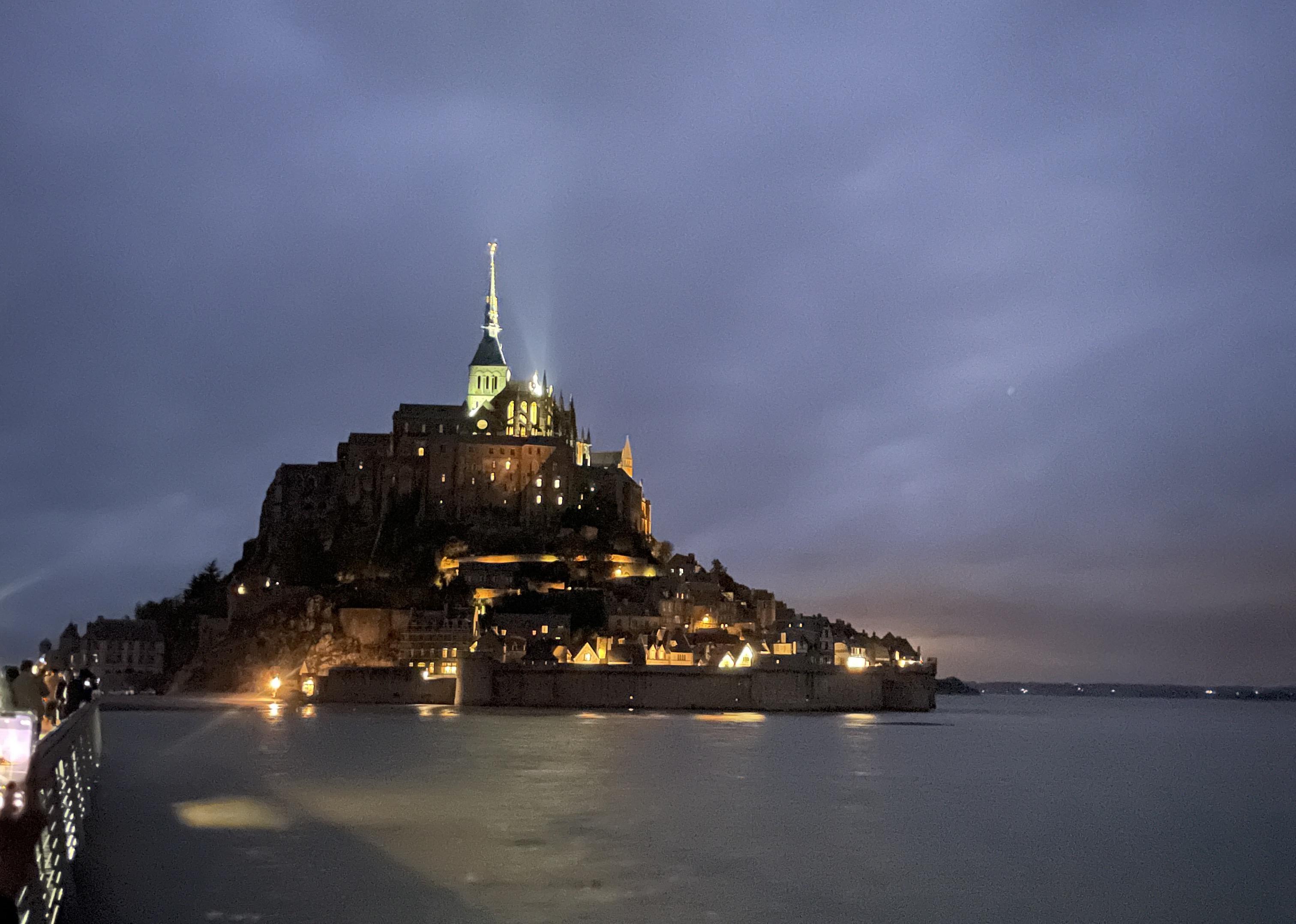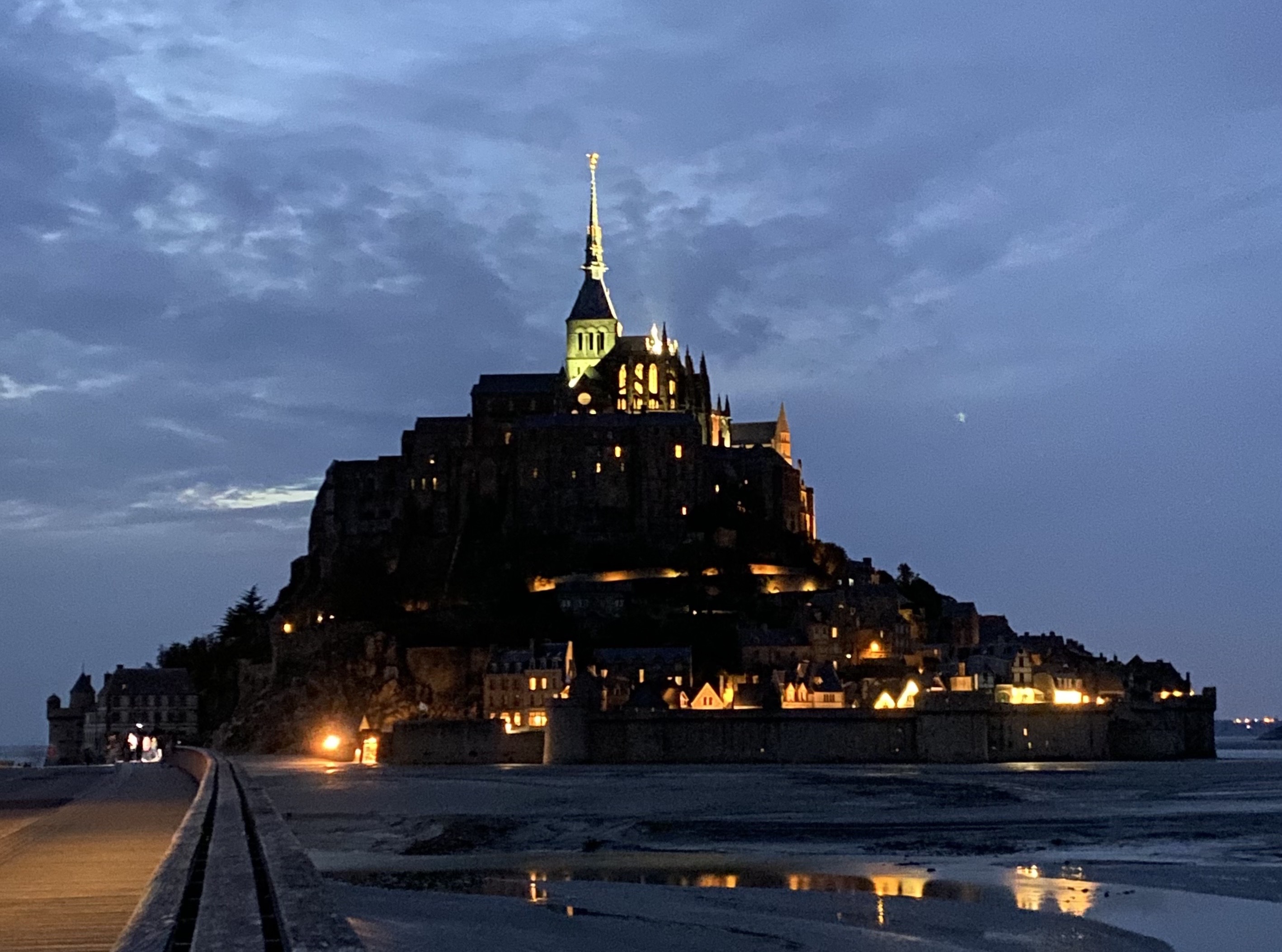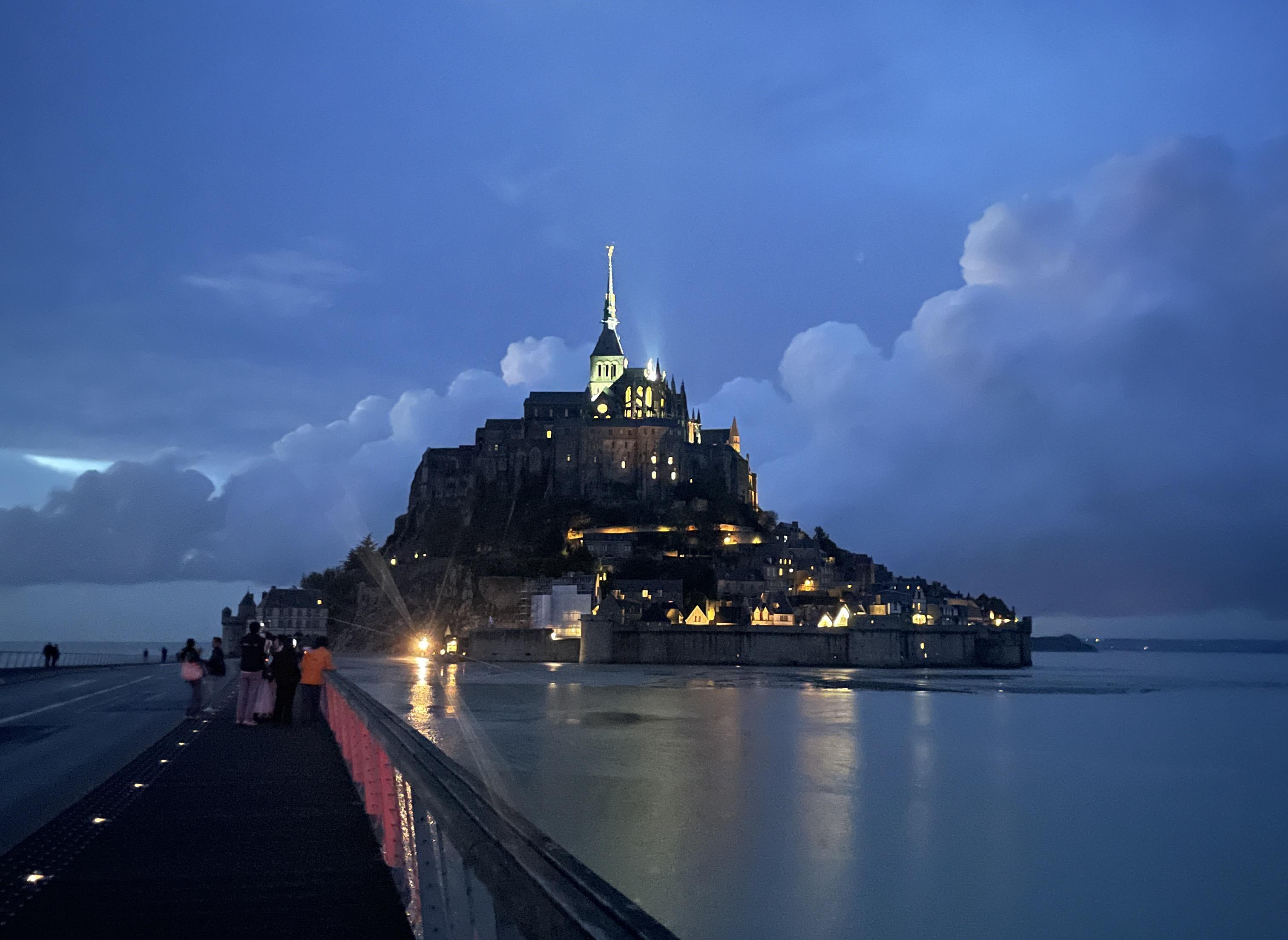 황홀한 핑크 몽생미셸... 9월 10월에는 가을비도 자주 내리지만 이렇게 핑크하늘을 (진짜 드물게) 볼 수 있다. 그리고 요렇게 만조의 몽생미셸을 보고 싶다면 몽생미셸의 만조표를 확인해 보고 예약을 하는 것도 좋겠다. 성수기에는 보통 5시에 몽생미셸에 도착해서 저녁 6:30에 밥을 먹고 저녁 7:30-8:00 사이에 나와 야경을 보니 그때 물이 들어오는 타이밍에 투어를 신청한다면 물이 찬 몽생미셸을 볼 수가 있다. 8시 45분의 모습.