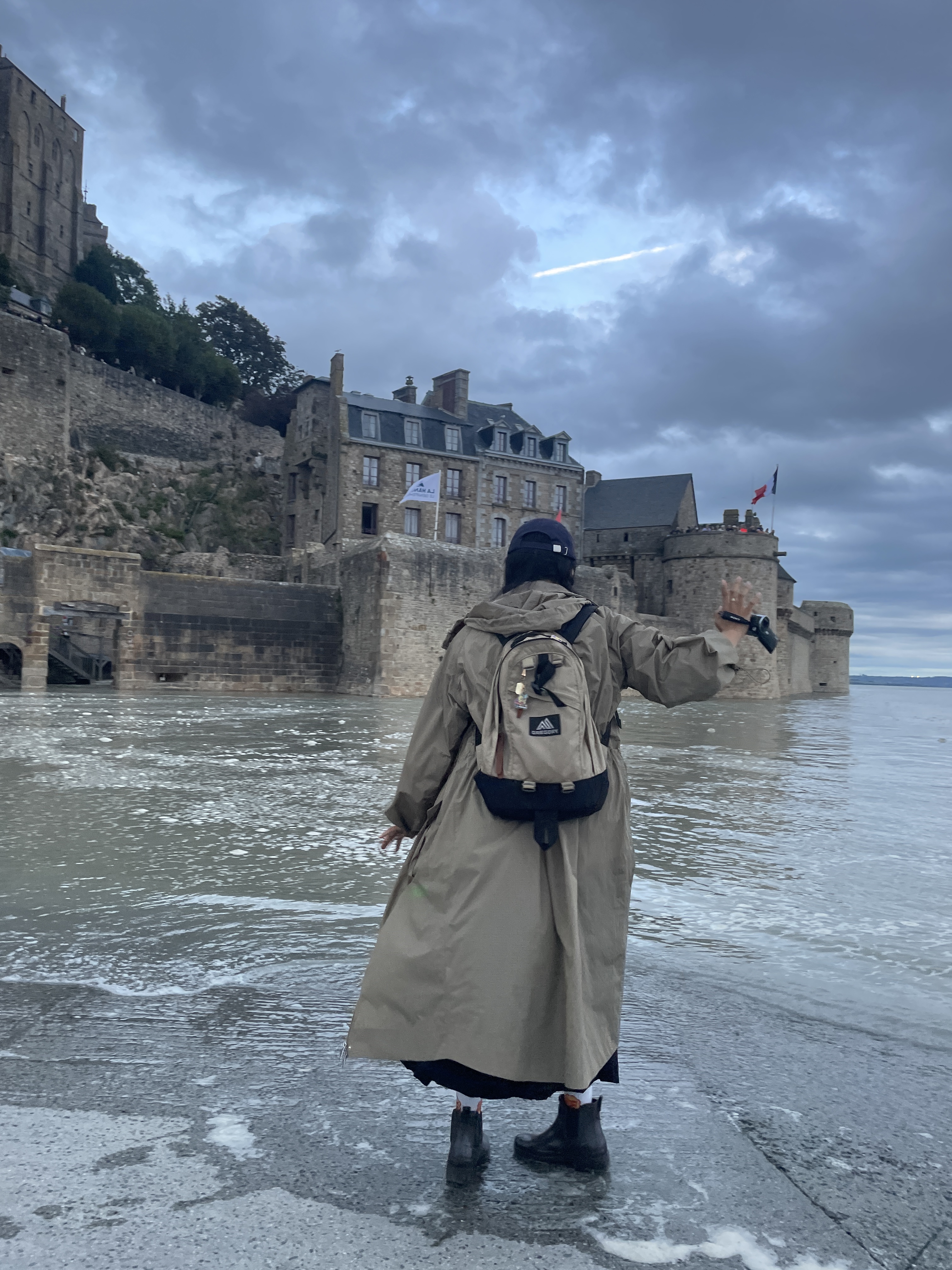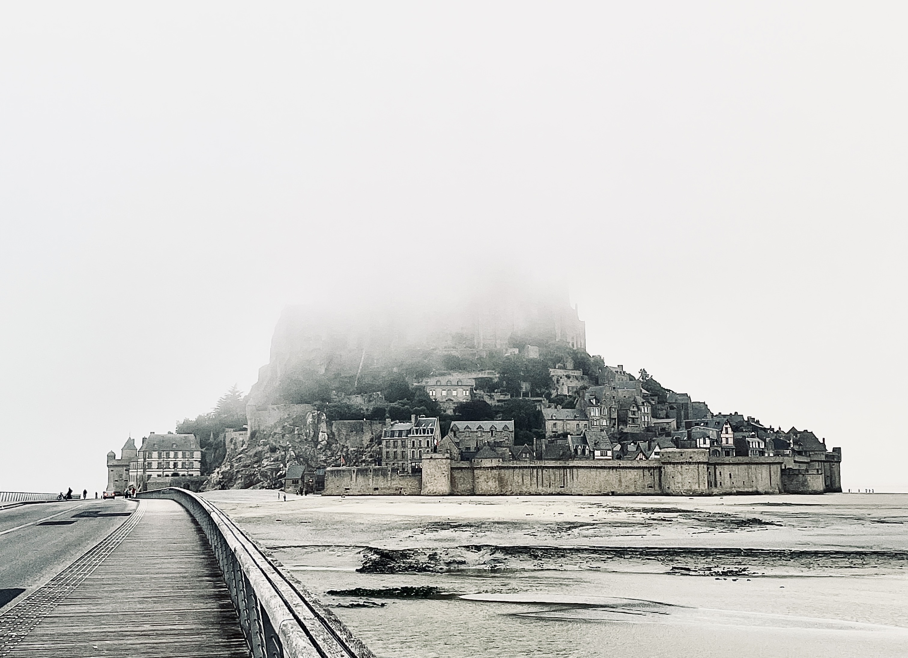 이런 날 갈까 봐 무서우시죠...? 그래도 초긍정 여행자분들과 함께해서 기분 좋았던 날. 내가 직접 여행자분들 사진에 포토샵을 해서 나눠드렸다. 마치 몽생미셸과 함께 찍은 사진인 것처럼 ㅎㅎ 다들 사진을 받으시고 웃으시면서 좋아하셨다. (후기에도 박제해 주심 😂) 다음에 날씨 좋을 때 다시 오신다고 했는데, 꼭 다시 뵙고 싶다! 나는 이런 날을 처음 보는 지라 너무 몽환적이고 아름다웠다. 마치 누가 딱 수도원 부분만 가려놓은 것처럼 말이다. 이런 걸 옛날 사람들이 봤다면 아마도 신과 연결해서 생각하지 않았을까?